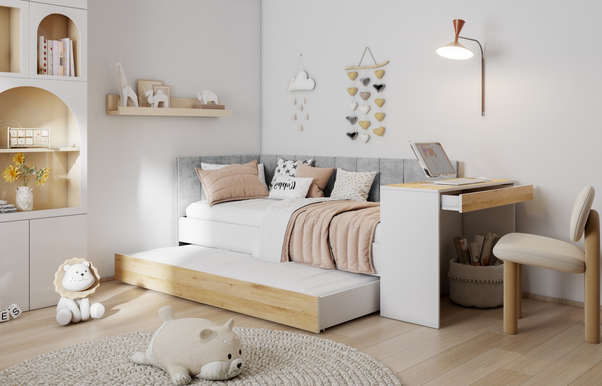 Jeśli dzieci są w podobnym wieku łatwiej zaaranżować przestrzeń. Dzieciom można na przykład zorganizować wspólne miejsce do zabawy. Doskonałym rozwiązaniem, które dzieci uwielbiają, a jednocześnie bardzo oszczędza przestrzeń jest łóżko piętrowe. Nowoczesne zestawy łóżek piętrowych dostępne są w formie wygodnych modułów, wyposażonych dodatkowo w biurko lub szafę.