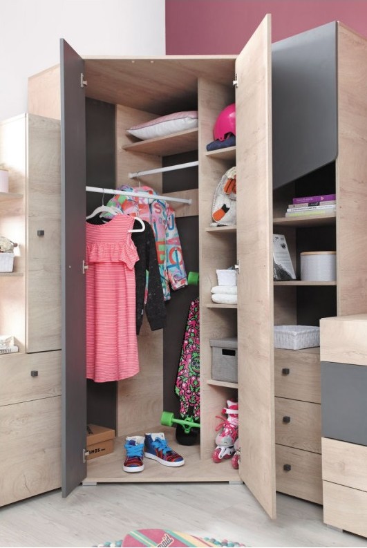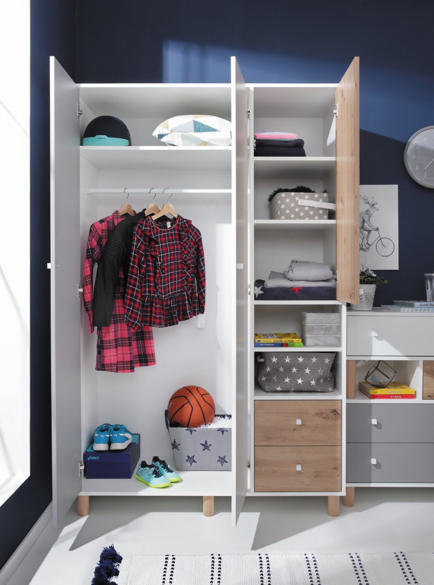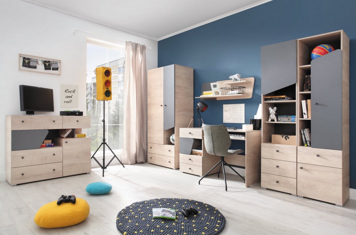 Modułowość - system składa się z wielu elementów, takich jak szafy, regały, biurka, komody i łóżka, które można dowolnie komponować w zależności od potrzeb i wielkości pomieszczenia.