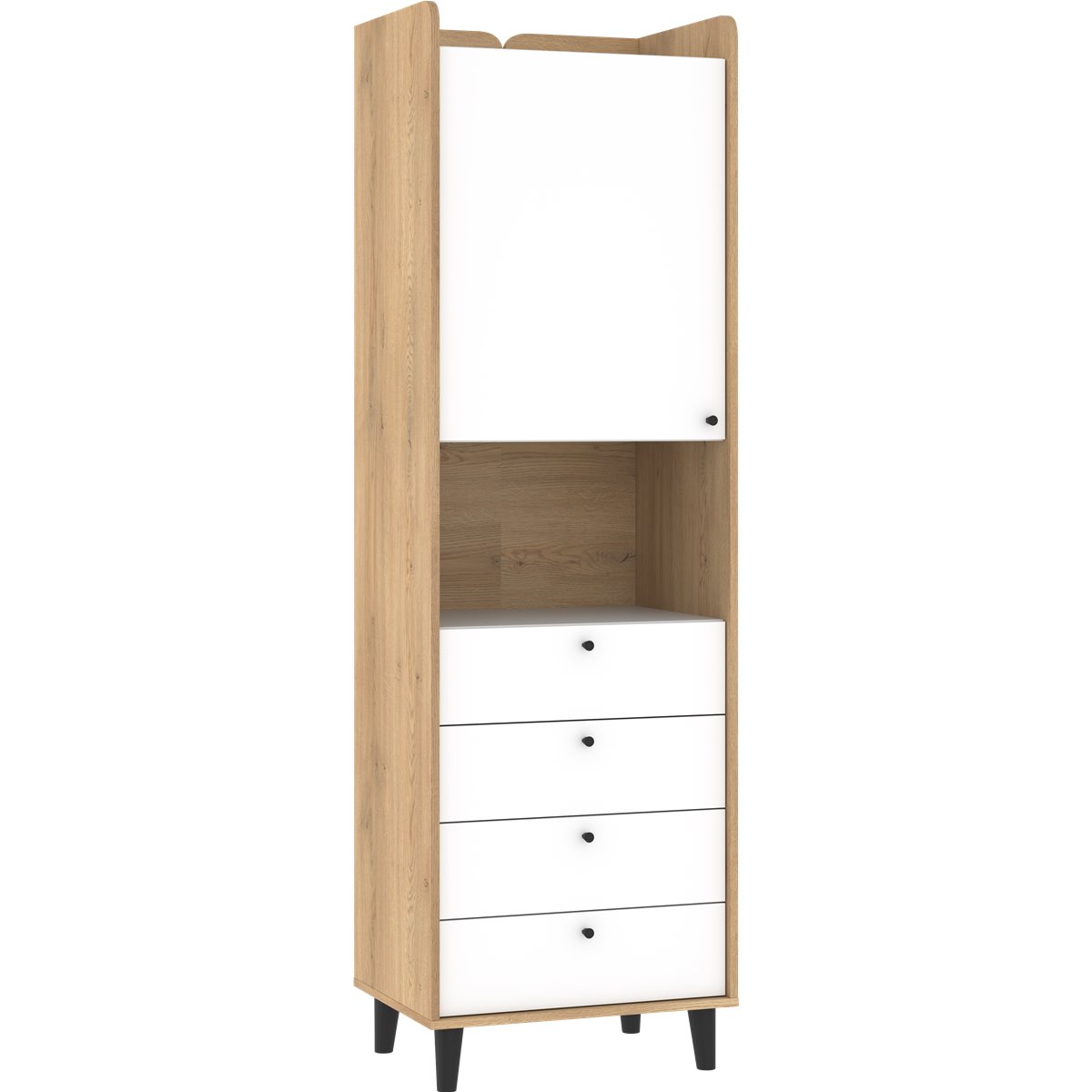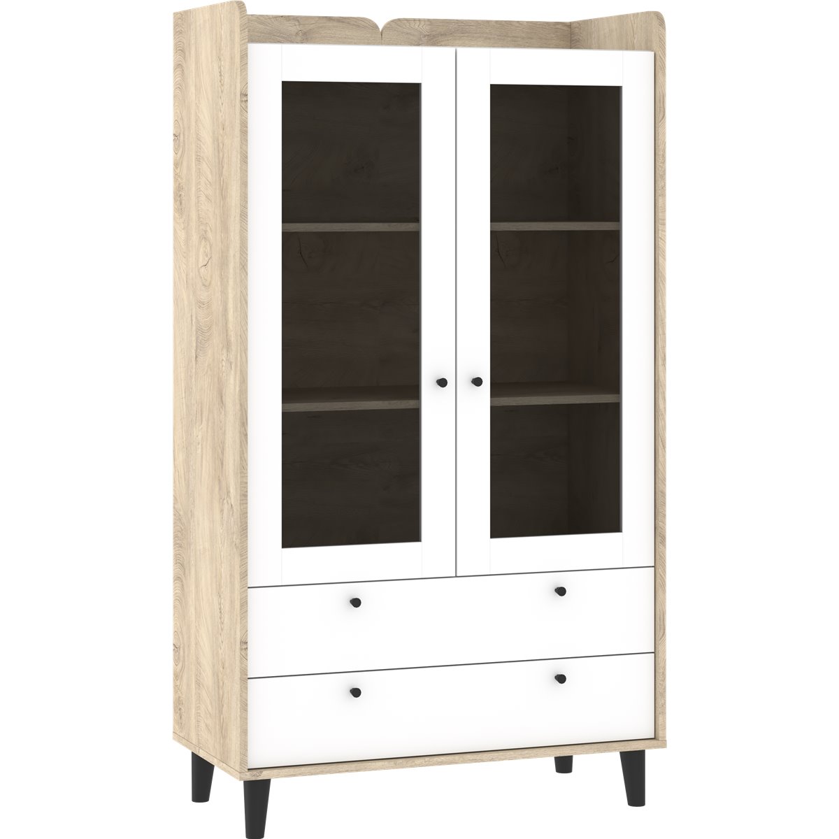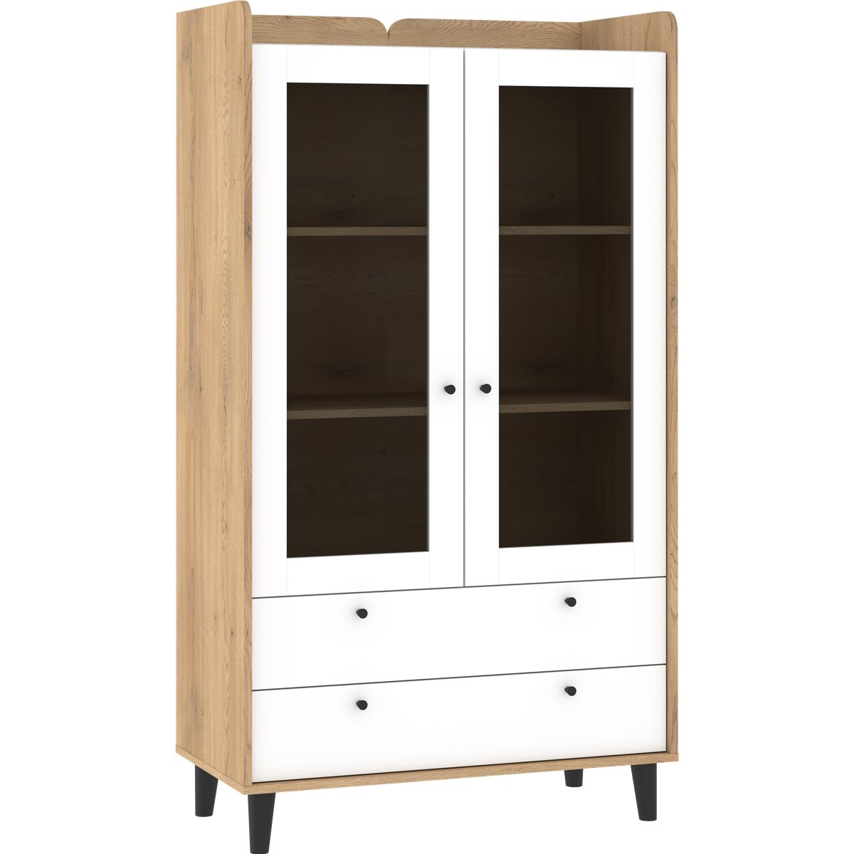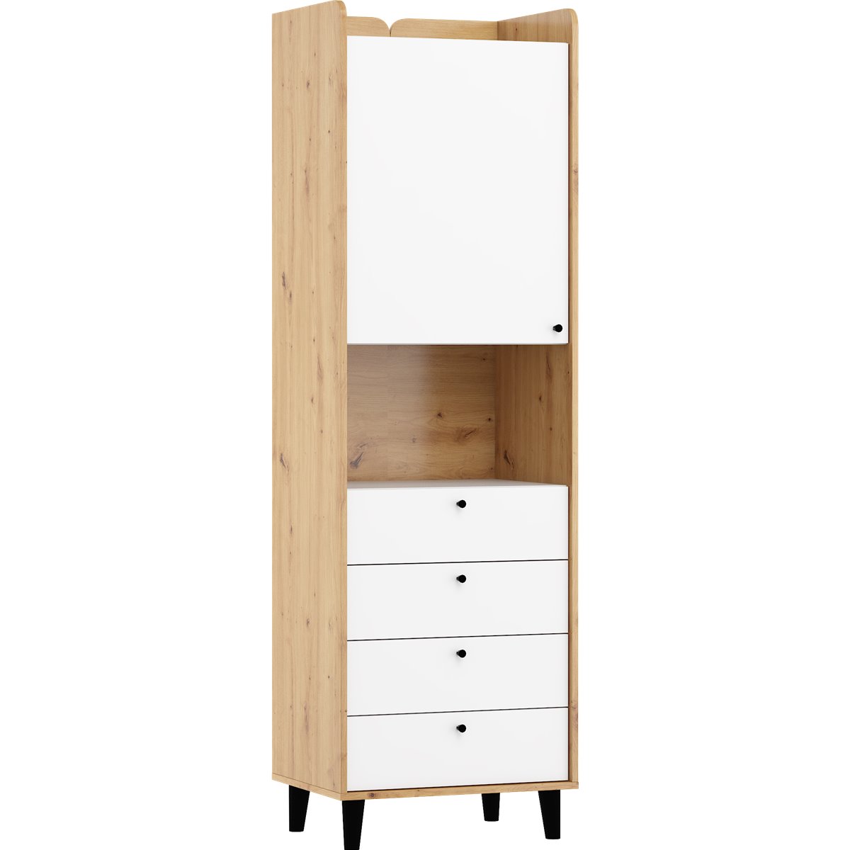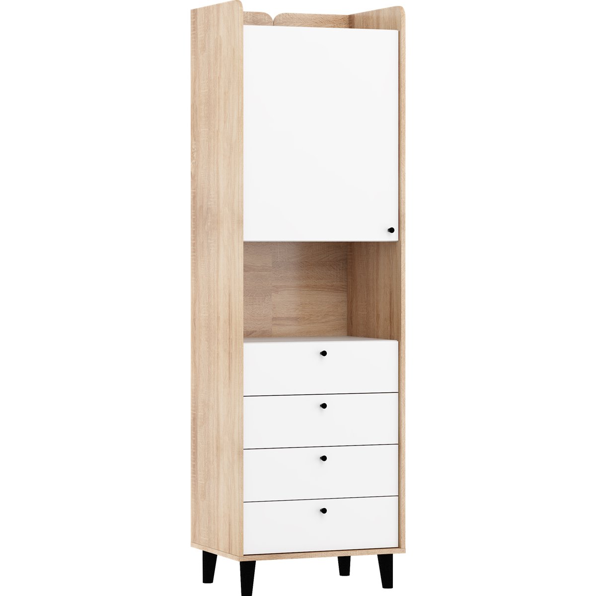 Komoda DOLCE wyposażona w 2-drzwiowy, częściowo przeszklony front za którym kryją się praktyczne półki oraz 4 szuflady. Drzwi i szuflady w standardzie posiadają cichy domyk co sprawia, że zamykają się płynnie. Drewniane, czarne nóżki podkreślają charakter mebla. Dzięki szerokiej gamie kolorów do wyboru na pewno wybierzesz coś dla siebie.