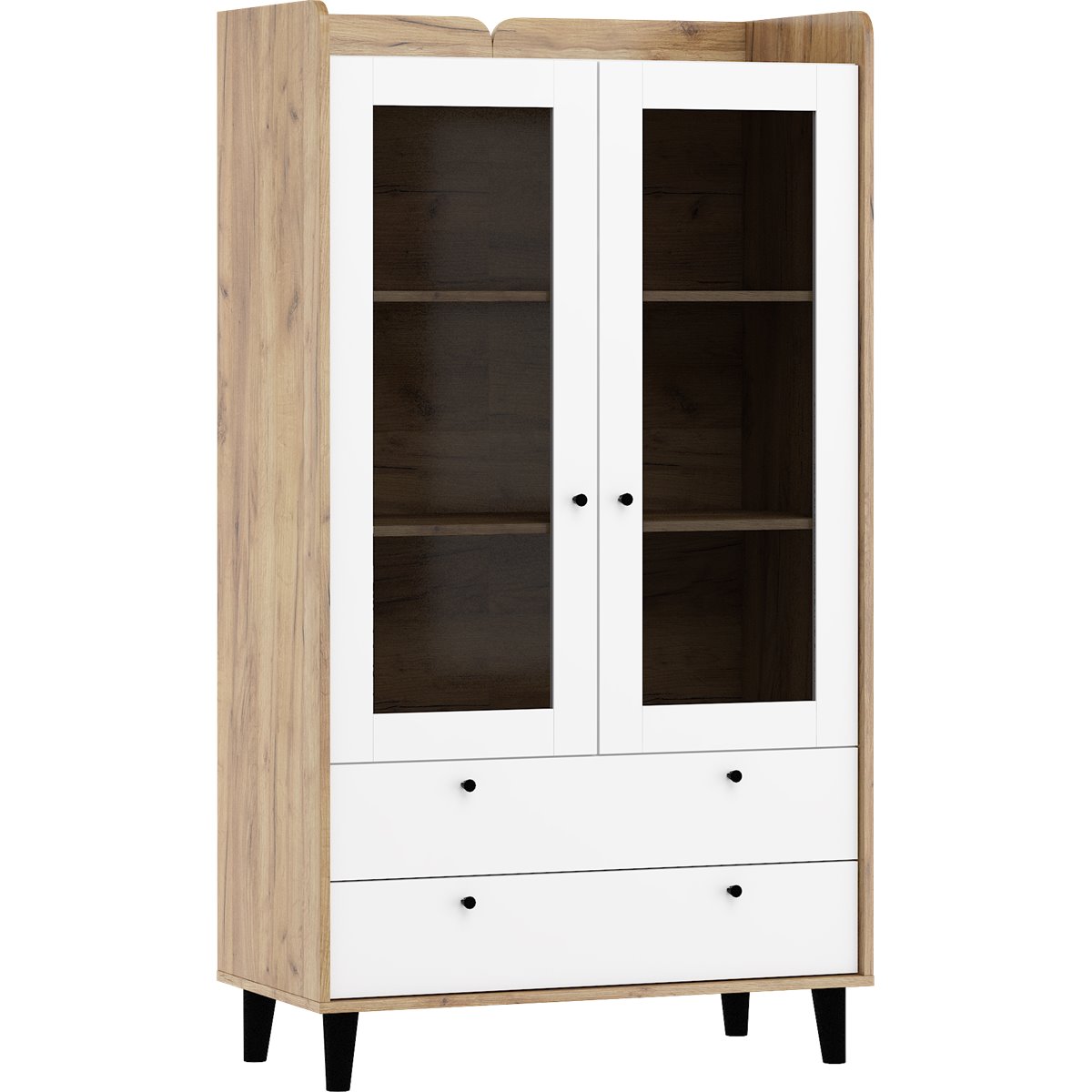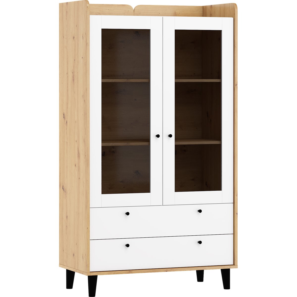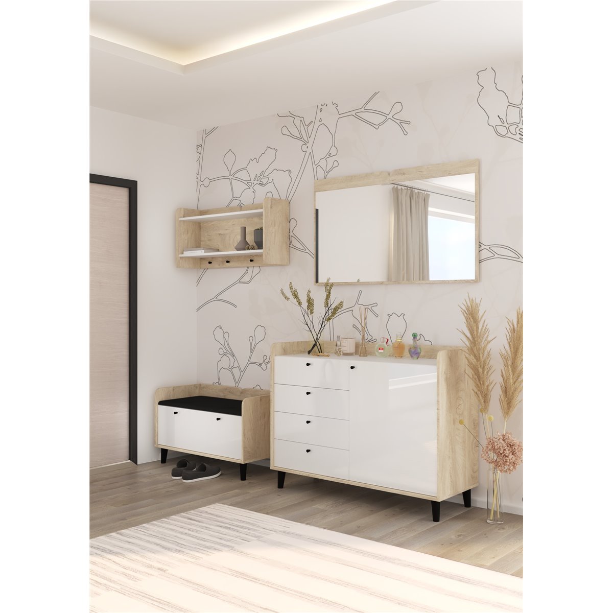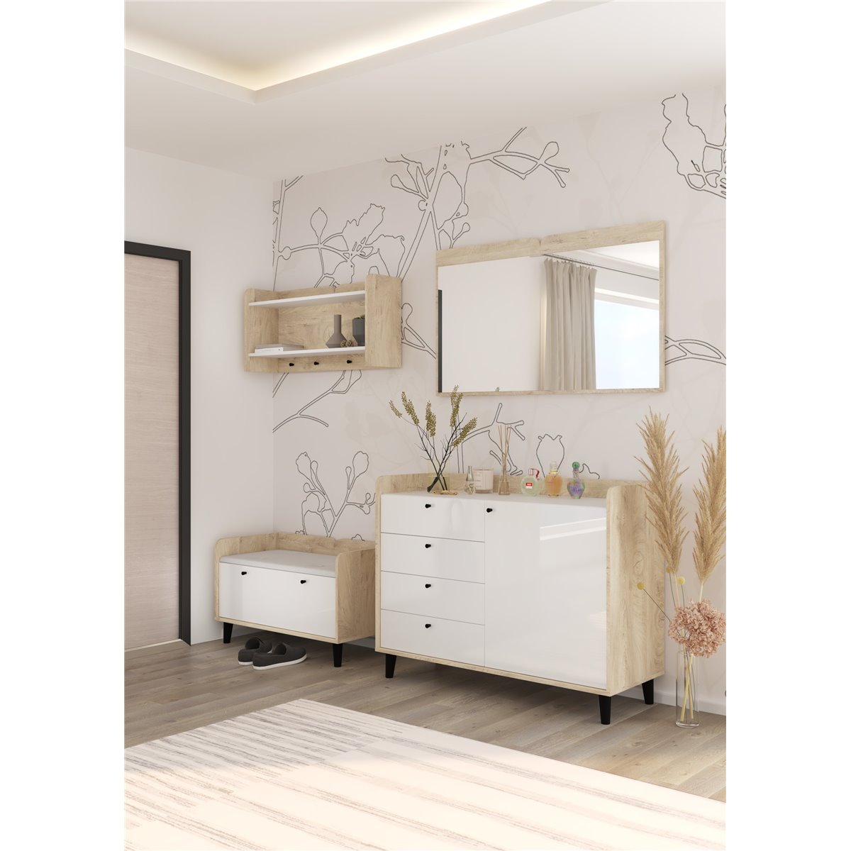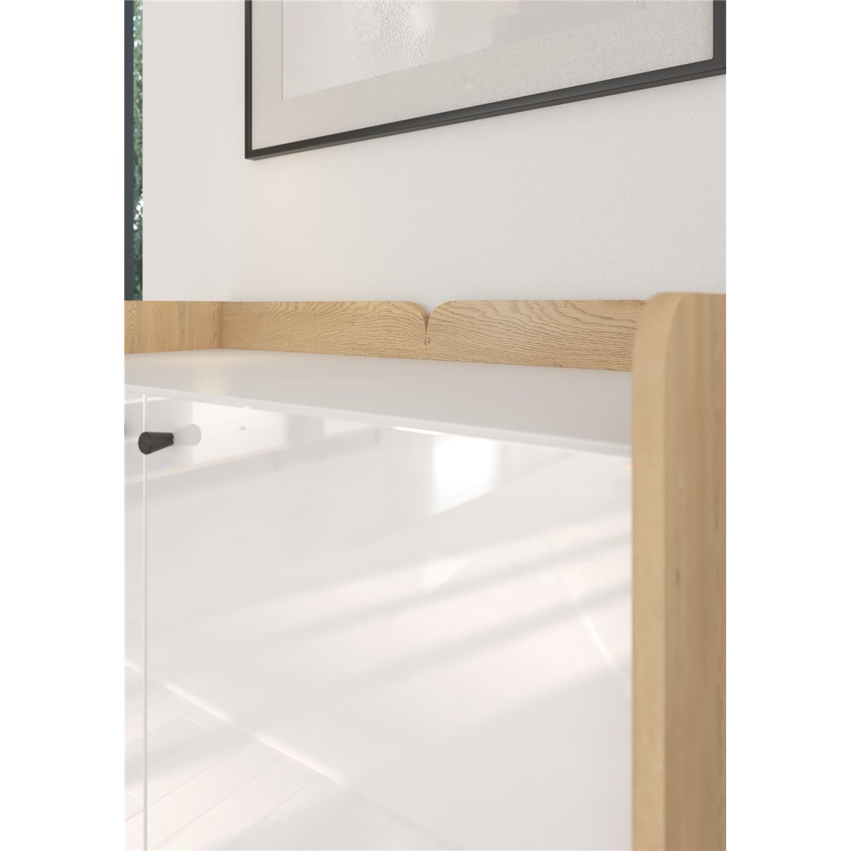 Komoda DOLCE wyposażona w 2-drzwiowy, częściowo przeszklony front za którym kryją się praktyczne półki oraz 4 szuflady. Drzwi i szuflady w standardzie posiadają cichy domyk co sprawia, że zamykają się płynnie. Drewniane, czarne nóżki podkreślają charakter mebla. Dzięki szerokiej gamie kolorów do wyboru na pewno wybierzesz coś dla siebie.