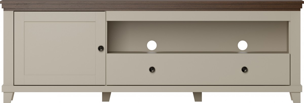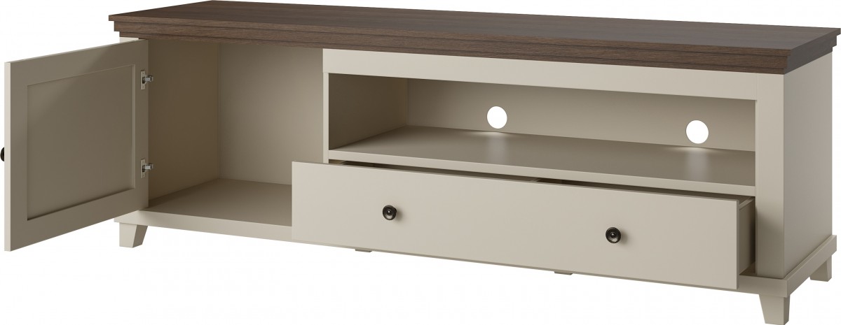 Kolekcja dostępna jest w efektownej kolorystyce zieleń + dąb lefkas, która łączy głębię eleganckiej zieleni z ciepłem naturalnego dekoru drewna, tworząc stylowe i nastrojowe aranżacje. Wybrane bryły oferowane są także w wariancie beż jasny + dąb dunin, stanowiąc subtelną, jasną i uniwersalną alternatywę, idealną do bardziej stonowanych wnętrz. Obie wersje kolorystyczne doskonale podkreślają klasyczny charakter mebli, zapewniając spójną i harmonijną aranżację całego domu.