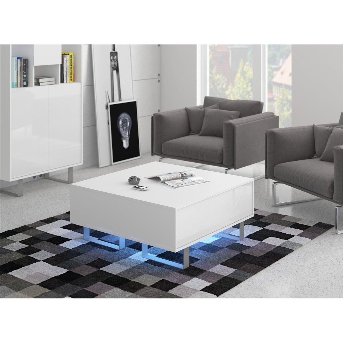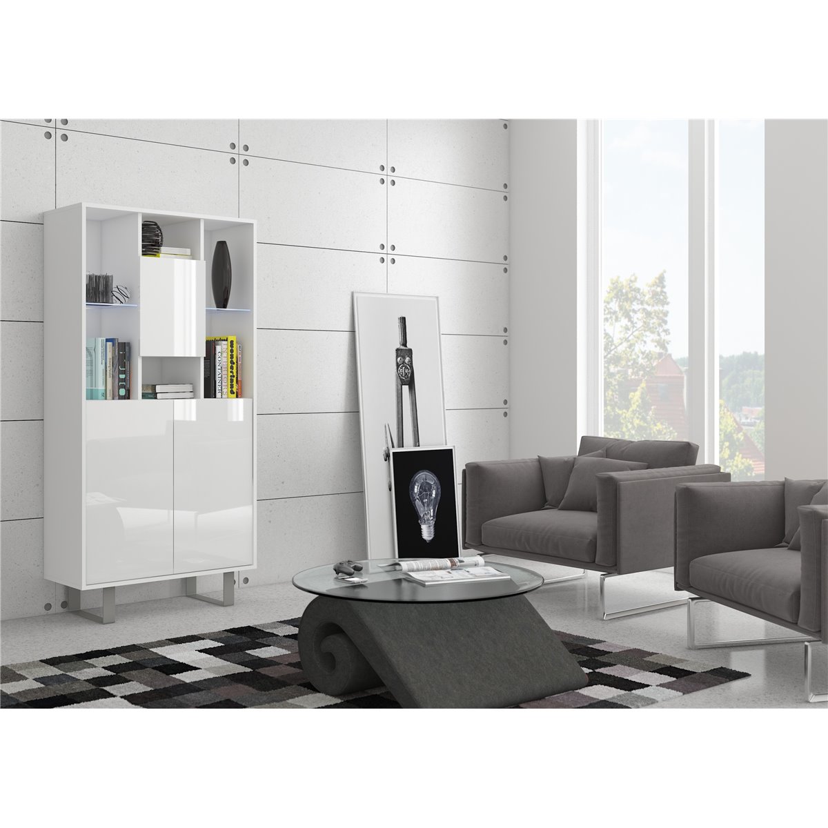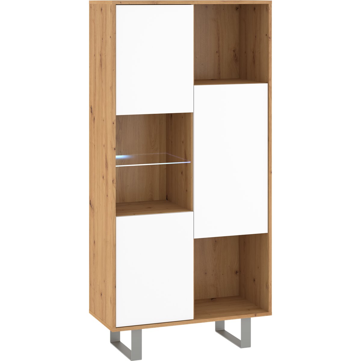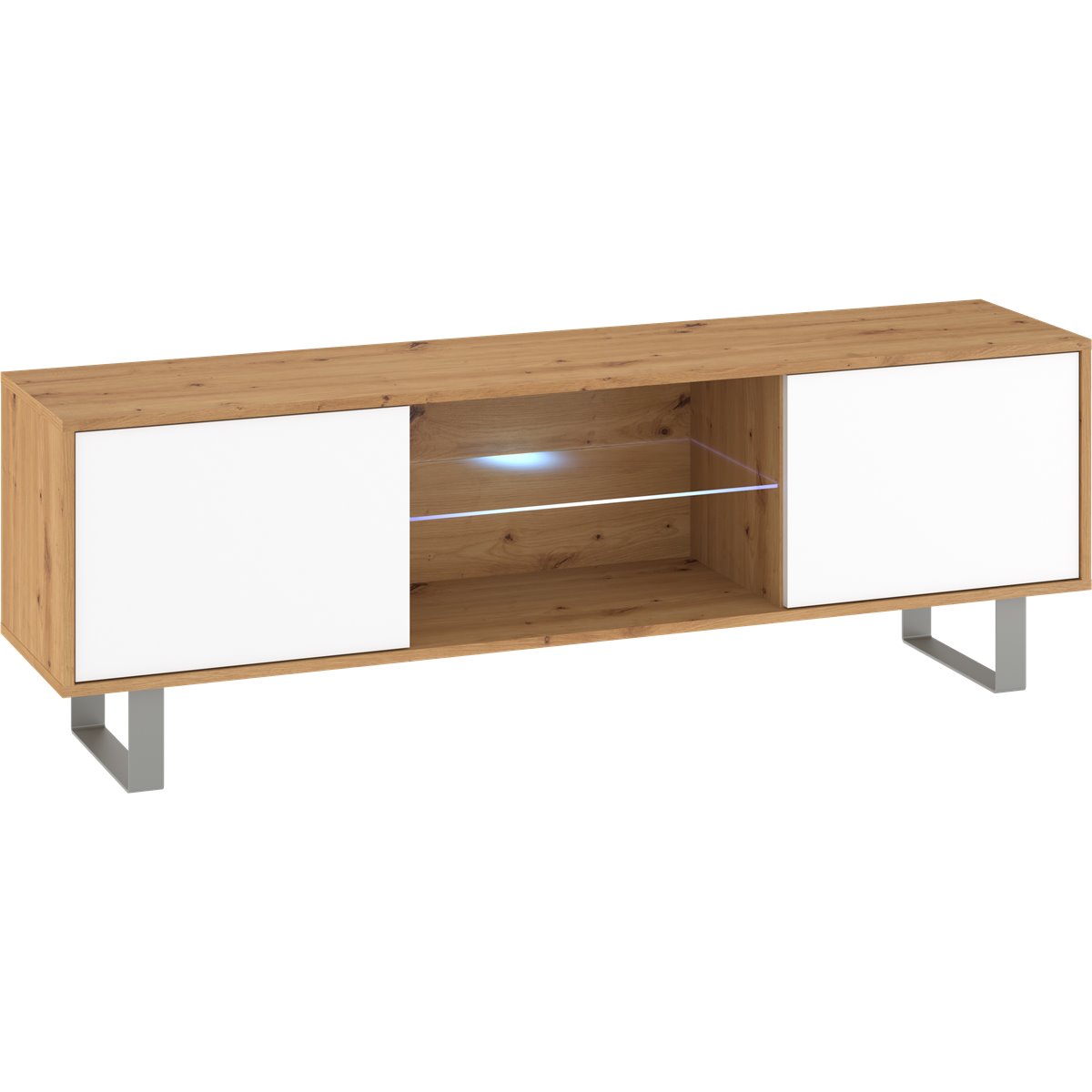 Komoda KING wyposażona została w 3-drzwiowy front oraz widocznej wnęki. Widoczne metalowe nóżki podkreślają nowoczesność mebla. W drzwiczkach oraz szufladach zrezygnowano z tradycyjnych uchwytów na rzecz wygodnego oraz modnego systemu "push to open", naciśnięcie na front sprawia że płynnie się otwierają.