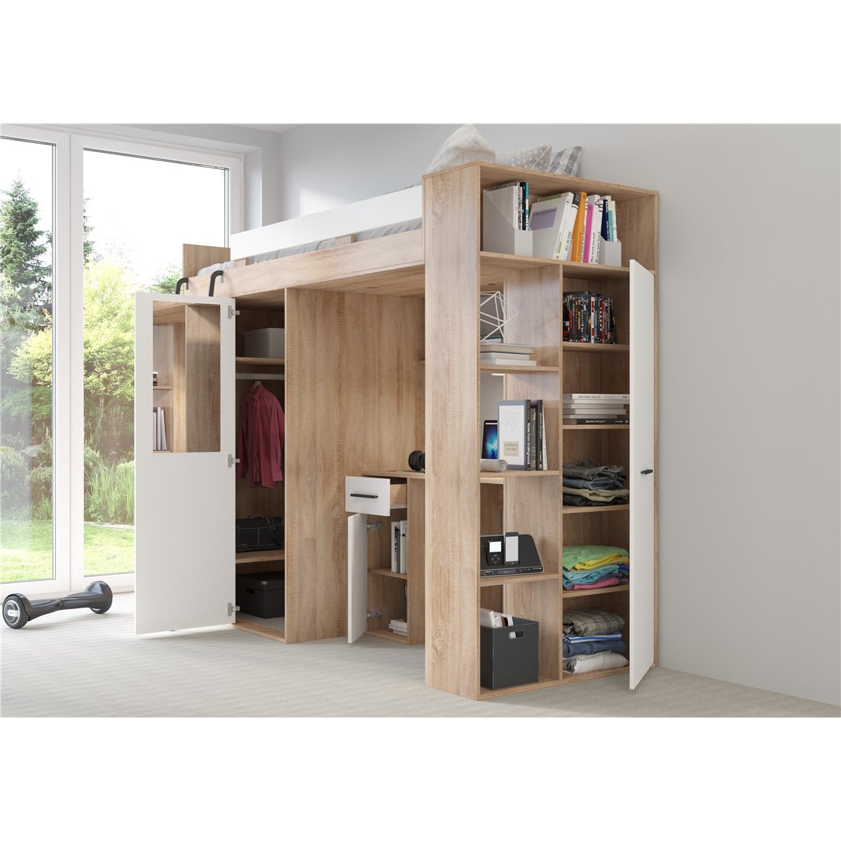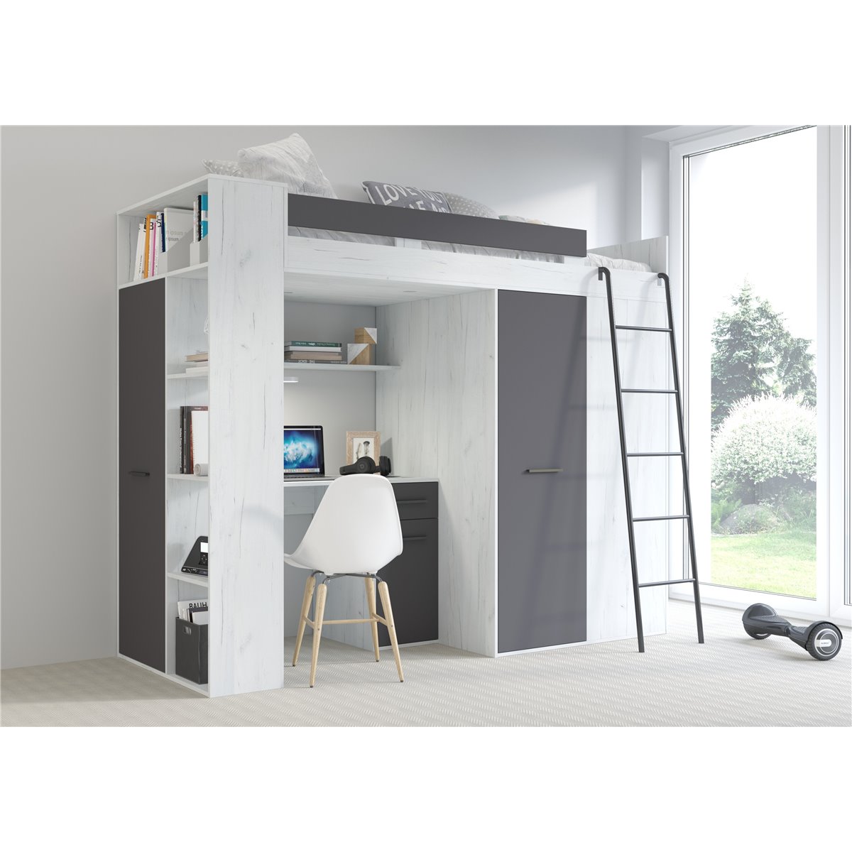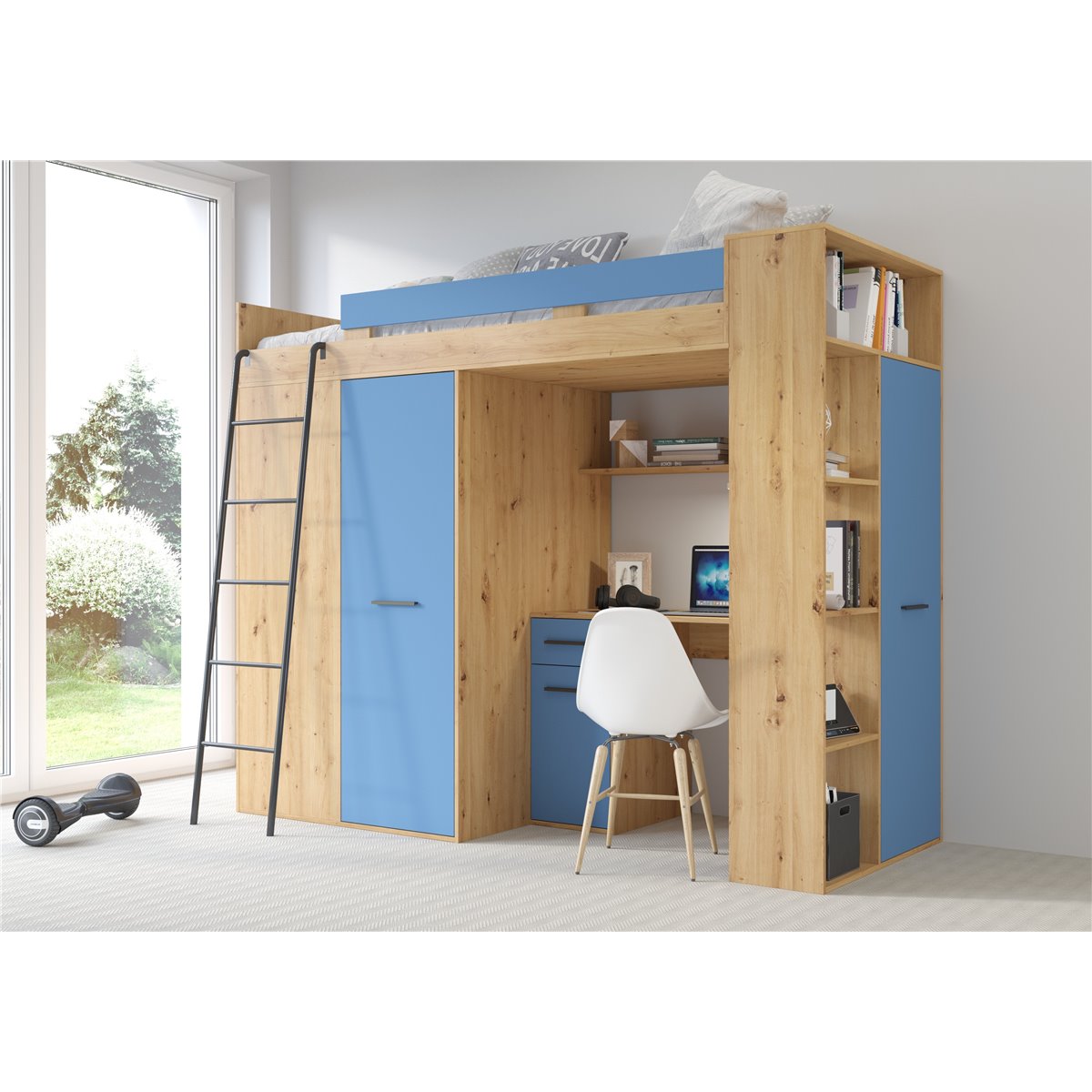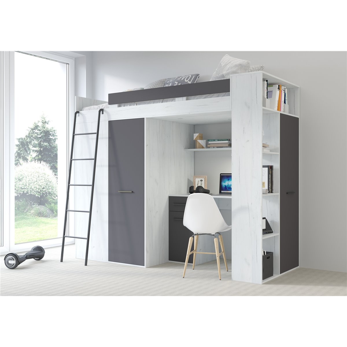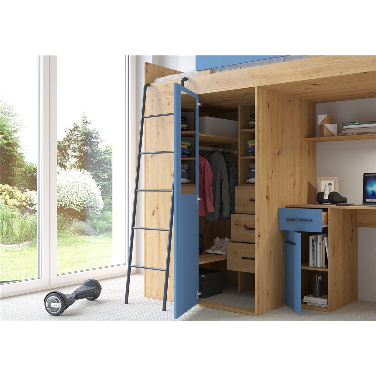VERANA to świetna propozycja do niewielkiej sypialni dziecka. W skład bryły wchodzą najpotrzebniejsze elementy takie jak pojemna szafa, łóżko o powierzchni spania 80x200 oraz biurko. Liczne półki oraz szafki pomogą utrzymać porządek, a dzięki kolorystyce do wyboru dopasujesz mebel do pokoju chłopca i dziewczynki.