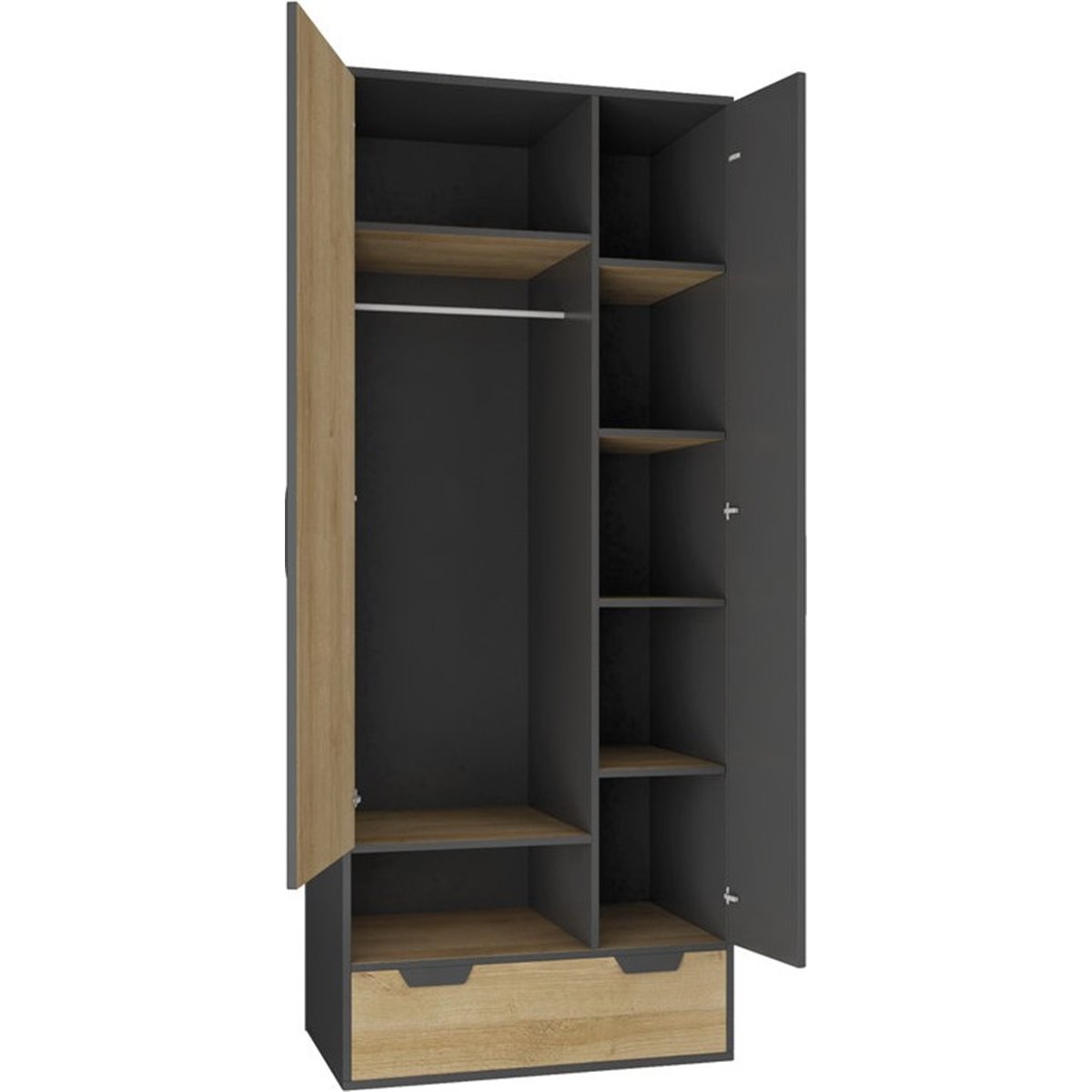 Grafit + Dąb Riviera – połączenie surowego grafitu z ciepłym, naturalnym dekorem drewna Dąb Riviera sprawia, że pokój zyskuje przytulność i charakter loftowy. To doskonały balans między nowoczesnością a domowym klimatem.